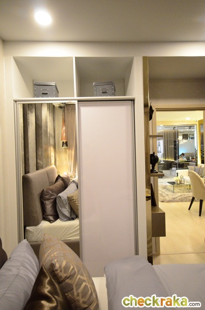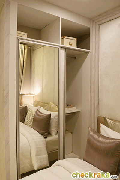 ทางโครงการให้ตู้เสื้อผ้า Built-in สูงจรดฝ้า หน้าบานข้างหนึ่งเป็นกระจกแบบเต็มบาน อีกข้างเป็น Hi-Gloss ด้านบนเป็นช่องเก็บของแบบไม่มีหน้าบานปิดอาจเก็บฝุ่นบ้างคงต้องทำความสะอาดบ่อยหน่อย