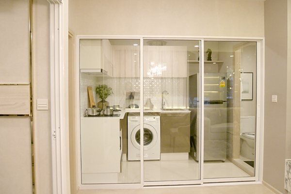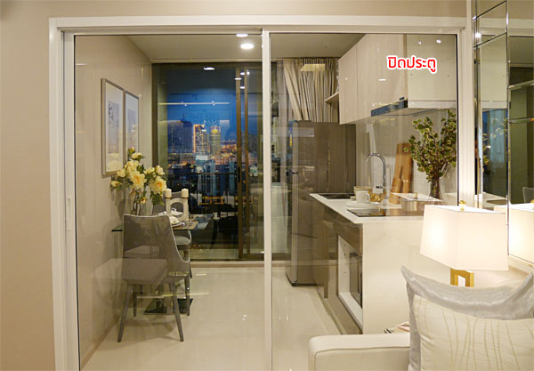 ห้องครัวแบบปิดมีประตูกระจกบานเลื่อนแบบ 2 ตอนกั้นมาให้