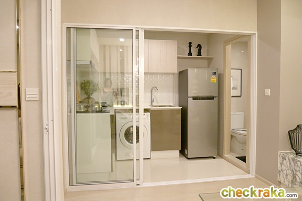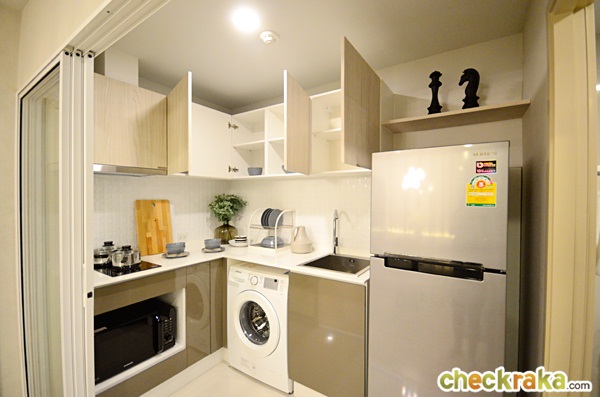 ได้ตู้เสื้อผ้า Built-in เหมือนกันกับห้องที่แล้ว ครัวย้ายมาอยู่ด้านใน ไม่ได้เชื่อมกับระเบียงเหมือนห้องที่แล้ว โดยห้องครัวมีขนาดใหญ่มากขึ้น