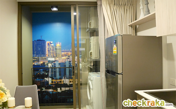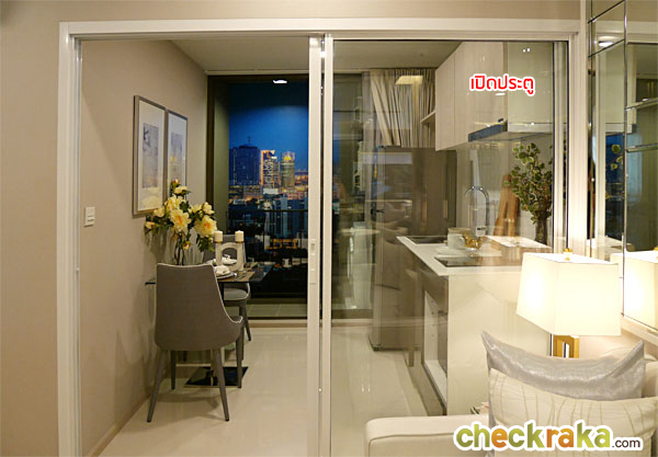 ภายในห้องครัว สามารถวางโต๊ะทานข้าวขนาด 2 ที่นั่งได้ ประตูระเบียงบานเลื่อนแบบ 2 ตอน กรอบอลูมิเนียมสีน้ำตาลอมเทา