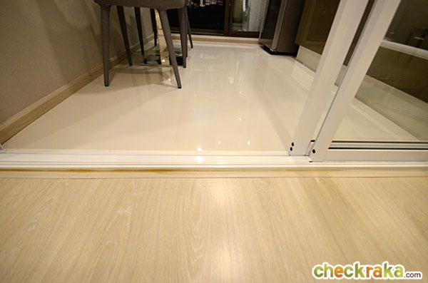 รางประตูสูงจากพื้นนิดหน่อยเวลาเดินระวังสะดุดด้วยนะคะ ส่วนพื้นห้องครัวปูด้วยกระเบื้องแกรนิตโต้
