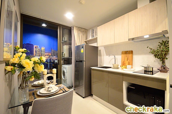 พื้นที่ห้องครัวขนาดกว้างขึ้น ได้เคาน์เตอร์ครัวรูปตัว L อยู่ติดกับส่วนของห้องน้ำ