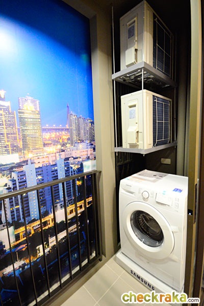 เครื่องซักผ้า และ คอมเพรสเซอร์แอร์จะอยู่ทางขวา มีระแนงช่วยบังสายตาจากภายนอก