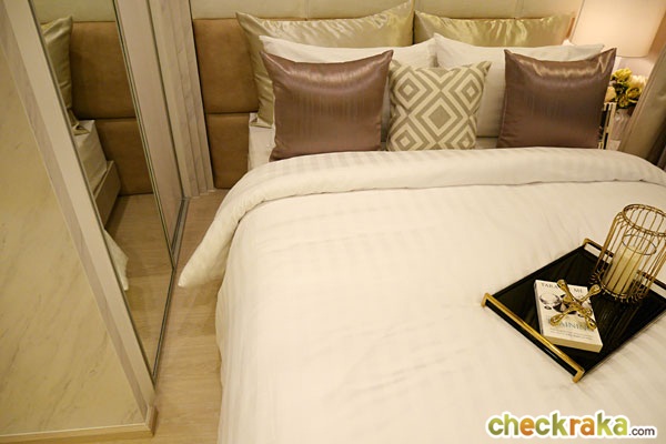 บริเวณปลายเตียงทางโครงการตกแต่งด้วยกระจกบานใหญ่ทำให้ห้องนอนดูกว้างมากขึ้น
