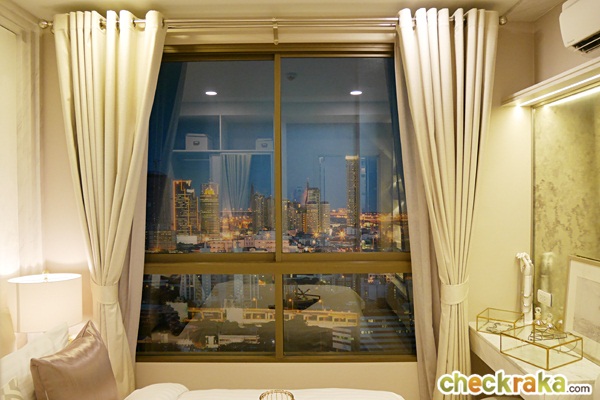 ระยะห่างจากเตียงถึงตู้เสื้อผ้าประมาณ 32 ซม. และระยะห่างจากเตียงถึงหน้าต่างประมาณ 45 ซม. หน้าต่างทรงสูงแบบบานเลื่อน 2 ตอน ไม่ได้ม่าน