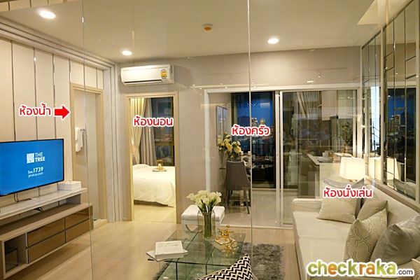 ภายในห้องจะแบ่งออกเป็น 4 ห้องหลักๆ คือห้องนั่งเล่น ห้องครัว ห้องนอน และห้องน้ำ