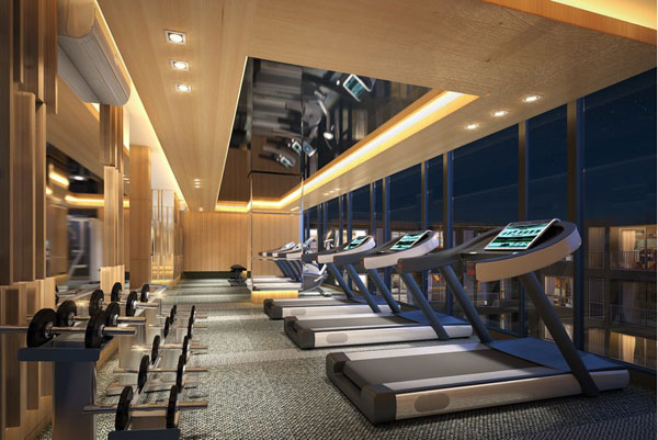 ห้อง Fitness ตั้งอยู่บริเวณชั้น 8 มองลงมาเห็นสวนด้านล่าง มีเครื่องเล่นให้ประมาณ 6 เครื่อง ตัวหน้าจอเป็นแบบ touch screen สามารถดูหนัง หรือเล่นอินเทอร์เน็ตได้