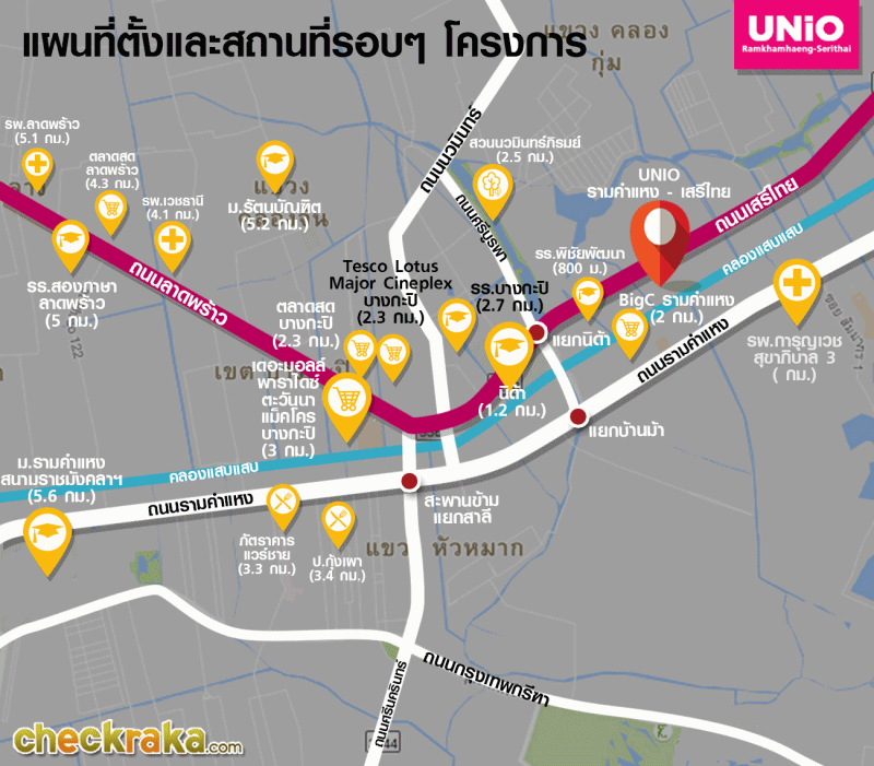 โครงการ ยูนิโอ รามคำแหง เสรีไทย ตั้งอยู่ติดถนนใหญ่เสรีไทยหรือถนนสุขาภิบาล 2 ซึ่งเป็นถนนที่เชื่อมต่อกับถนนหลักอย่างถนนลาดพร้าว ถนนนวมินทร์ ถนนรามคำแหง และถนนศรีนครินทร์ ใกล้ม.นิด้า รร.พิชัยพัฒนา เดอะมอลล์ บางกะปิ นอกจากนี้ยังใกล้รถไฟฟ้าสายสีส้ม (ในอนาคต) ที่จะพาดผ่านถนนรามคำแหงด้วย