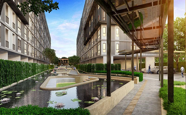 ภาพจำลองบรรยากาศบ่อบัวที่ออกแบบทำเป็นที่นั่งซึ่งตั้งอยู่ระหว่างอาคาร B และ อาคาร C