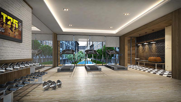 ภาพจำลองบรรยากาศภายในห้องฟิตเนสที่มองออกไปเห็นสระว่ายน้ำ