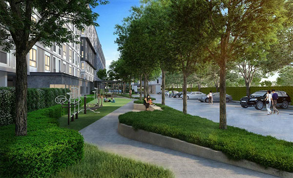 ภาพจำลองบรรยากาศสวนด้านข้างอาคาร A ซึ่งมีอุปกรณ์สำหรับออกกำลังกายกลางแจ้ง และ Jogging Track มาให้ด้วย