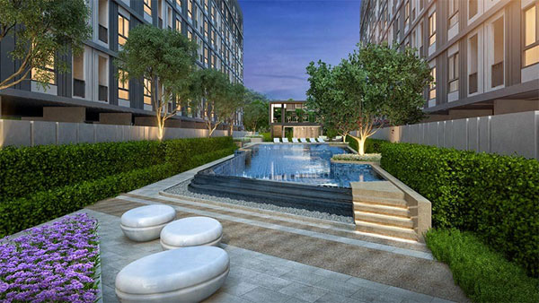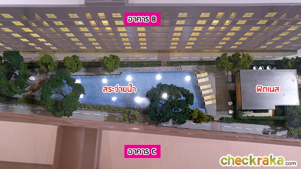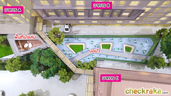 ถัดไปเป็นพื้นที่นั่งเล่น และบ่อบัว ที่ตั้งอยู่ระหว่างอาคาร B และอาคาร C