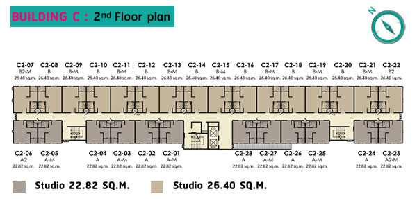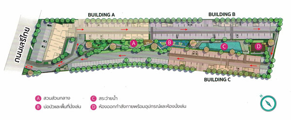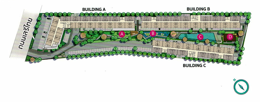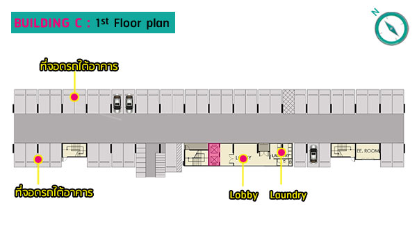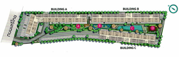 ชั้นล่าง : โถงต้อนรับ, สำนักงานนิติบุคคล, ตู้จดหมาย, ห้องซักรีด, พื้นที่จอดรถ (บริเวณใต้อาคาร), ลิฟต์โดยสาร 2 ตัว อัตราส่วนลิฟต์ของอาคารนี้เท่ากับ 126:1 ชั้น 2-8 เป็นส่วนพักอาศัยมียูนิตต่อชั้นอยู่ที่ 36 ยูนิต เป็นห้องขนาด 22.82 ตร.ม. จำนวน 16 ยูนิต และห้องแบบ 26.40 ตร.ม. จำนวน 20 ยูนิต Master Plan อาคาร C ชั้นล่าง : โถงต้อนรับ, สำนักงานนิติบุคคล, ตู้จดหมาย, ห้องซักรีด, พื้นที่จอดรถ (บริเวณใต้อาคาร), ลิฟต์โดยสาร 2 ตัว อัตราส่วนลิฟต์ของอาคารนี้เท่ากับ 98:1 ชั้น 2-8 เป็นส่วนพักอาศัยมียูนิตต่อชั้นอยู่ที่ 28 ยูนิต เป็นห้องขนาด 22.82 ตร.ม. จำนวน 12 ยูนิต และห้องแบบ 26.40 ตร.ม. จำนวน 16 ยูนิต ส่วนกลางและสิ่งอำนวยความสะดวก