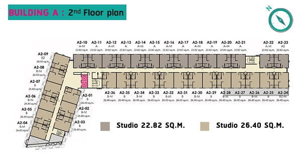 อาคาร A ทิศเหนือ และทิศตะวันตกจะเป็นห้องใหญ่ขนาด 26.40 ตร.ม. (สีน้ำตาล) โดยห้องฝั่งทิศตะวันออกจะได้วิวสีเขียวจากสวนทั้งหมด ส่วนทิศตะวันออกทั้งหมดจะเป็นห้องเล็กขนาด 22.82 ตร.ม. (สีเทา) จะได้ City View แทน