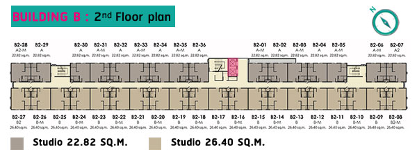 อาคาร B ทิศตะวันตกจะเป็นห้องใหญ่ขนาด 26.40 ตร.ม. ได้วิวบ่อบัว และวิวสระว่ายน้ำ ส่วนทิศตะวันออกทั้งหมดจะเป็นห้องเล็กขนาด 22.82 ตร.ม. (สีเทา) จะได้ City View
