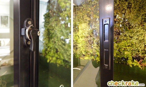 กรอบอลูมิเนียมสีดำ ยกธรณีสูงขึ้นมาเล็กน้อยเพื่อป้องกันน้ำจากระเบียงไหลเข้ามาภายในห้องครัว
