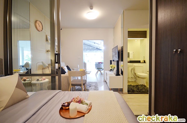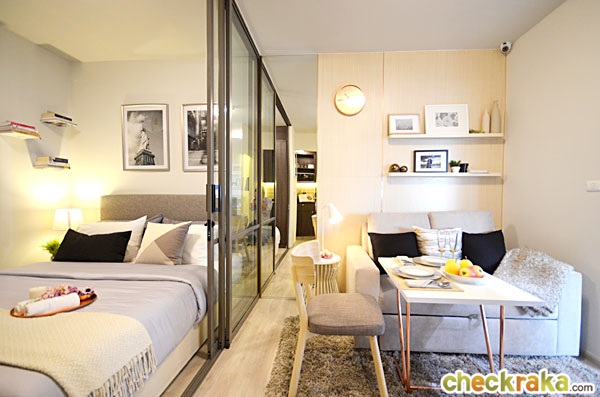 ห้องพักของโครงการนี้เป็นแบบห้อง Studio ทั้งหมด ซึ่งขายเป็นแบบ Fully Fitted หรือแบบห้องเปล่า สิ่งที่โครงการให้มาจะมีเพียง สุขภัณฑ์ภายในห้องน้ำ และชุด Built-in เคาน์เตอร์ครัว และแอร์ ติดตั้งในห้องนอน สำหรับห้องเล็กจะได้แอร์ขนาด 12,000 BTU ส่วนห้องใหญ่จะได้ขนาด 15,000 BTU ไม่มีเฟอร์นิเจอร์ให้นะคะ ที่เห็นในห้องตัวอย่างทางโครงการตกแต่งมาให้ดูเป็นไอเดียเท่านั้นนะคะ จุดเด่นของห้องอยู่ที่ความสูง 2.6 เมตร ซึ่งถือว่าค่อนข้างสูง ทำให้ห้องดูโปร่ง และโล่งมากขึ้น โดยมีห้องให้เลือก 2 ขนาดด้วยกันคือ