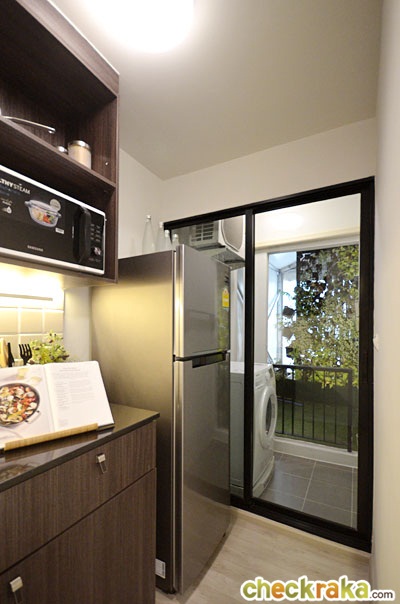พื้นที่วางตู้เย็นอยู่ระหว่างเคาน์เตอร์ครัวกับระเบียง ซึ่งประตูระเบียงเป็นบานเลื่อนแบบ 2 ตอน