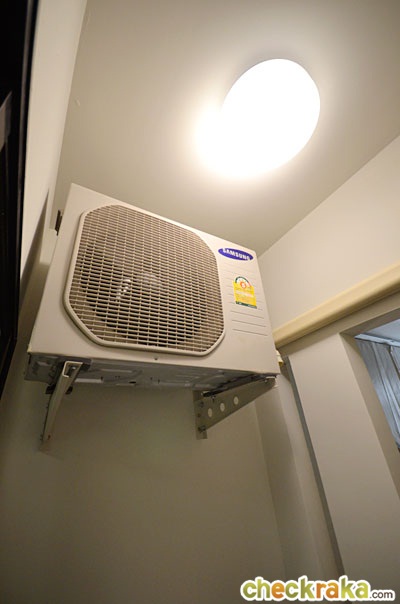 ราวระเบียงกันตกสูงประมาณ 1 เมตร ทางด้านขวาของผนัง ทางโครงการติดที่แขวนผ้ามาให้ดูเป็นตัวอย่างสามารถยืดหดได้ มีปลั๊กไฟพร้อมฝาครอบกันน้ำมาให้เรียบร้อย ด้านบนแขวนคอมเพรสเซอร์แอร์ ควรหากริลมาติดเพื่อเป่าลมร้อนให้ออกไปด้านนอกอาคาร บนเพดานติดโคมซาลาเปามาให้ 1 ดวง เข้าไปดูในห้องน้ำกันต่อค่ะ