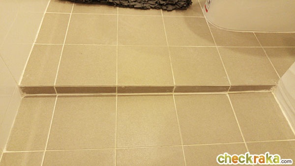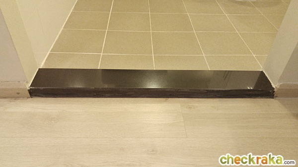 ระหว่างห้องครัวกับห้องน้ำมีธรณีหินแกรนิตสีดำกั้นมาให้ด้วย ส่วนพื้นห้องน้ำก็ลดระดับลงอีกเล็กน้อย