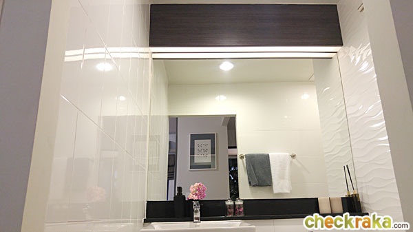 กระจกห้องน้ำที่ได้จริงจะเล็กกว่านี้ขนาดประมาณ 60x90 ซม. ด้านบนที่เป็นไฟซ่อนก็ไม่ได้นะคะ จะเป็นผนังเรียบธรรมดา