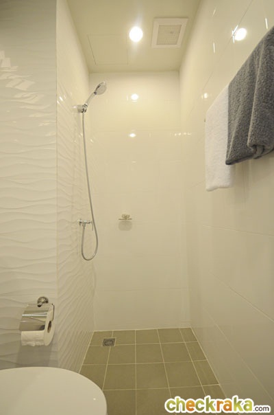 บนเพดานได้พัดลมดูดอากาศ และไฟดาวน์ไลท์ 2 ดวง ส่วนพื้นห้องน้ำปูด้วยกระเบื้องเซรามิกขนาด 20 ซม. พื้นที่อาบน้ำลดระดับลง