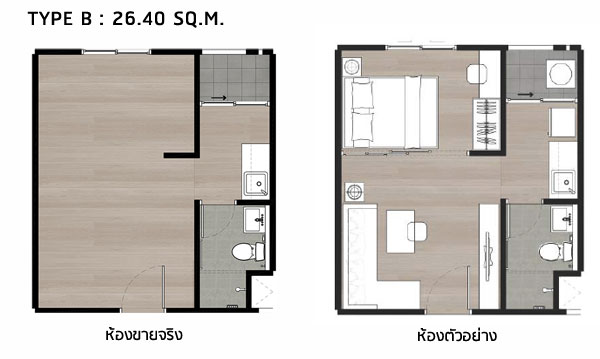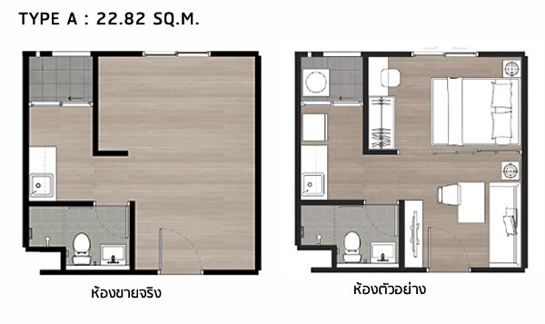 ห้องแบบสตูดิโอ พื้นที่ใช้สอย 22.82 ตร.ม. ห้องแบบสตูดิโอ พื้นที่ใช้สอย 26.40 ตร.ม. ห้องตัวอย่างแบบ Studio Type ขนาด 22.82 ตร.ม.