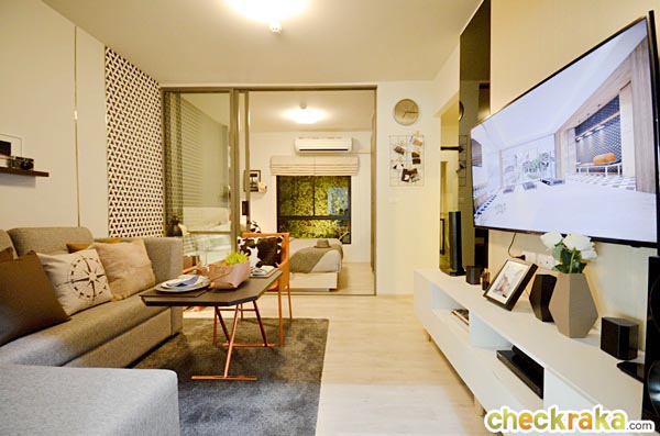 ห้องนั่งเล่นเชื่อมต่อกับห้องนอน กั้นด้วยประตูบานเลื่อน 3 ตอนมาให้ดูเป็นไอเดีย ข้อดีคือเป็นสัดส่วนมากขึ้น