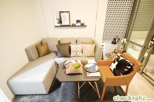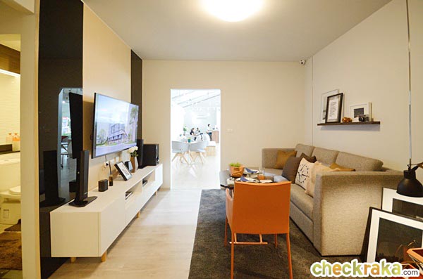 พื้นที่ห้องนั่งเล่นมีขนาดใหญ่มากขึ้นกว่าห้องที่แล้ว ห้องนี้ทางโครงการวางโซฟาแบบ L-Shape ขนาด 3 ที่นั่งมาให้ดู