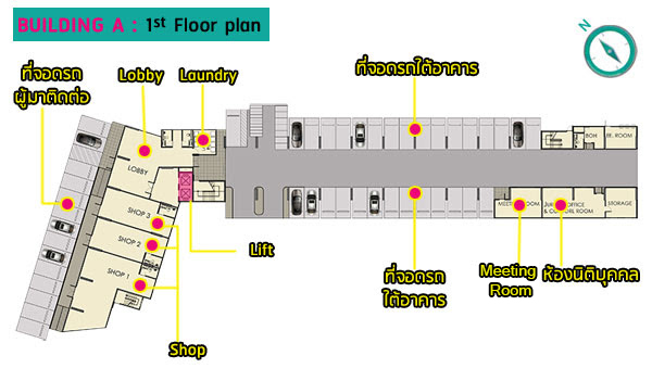Master Plan อาคาร A ชั้นล่าง : Shop ร้านค้า จำนวน 3 ร้าน (ด้านหน้าโครงการ), โถงต้อนรับ, สำนักงานนิติบุคคล, ห้องประชุม, ตู้จดหมาย, ห้องซักรีด, พื้นที่จอดรถ (ด้านหน้าโครงการ และบริเวณใต้อาคาร), ลิฟต์โดยสาร 2 ตัว อัตราส่วนลิฟต์ของอาคารนี้เท่ากับ 126:1 ชั้น 2-8 เป็นส่วนพักอาศัยมียูนิตต่อชั้นอยู่ที่ 36 ยูนิต เป็นห้องขนาด 22.82 ตร.ม. จำนวน 14 ยูนิต และห้องแบบ 26.40 ตร.ม. จำนวน 22 ยูนิต Master Plan อาคาร B