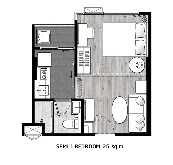 - ห้องแบบ Semi 1 bedroom พื้นที่ใช้สอย 26.00 ตร.ม.
