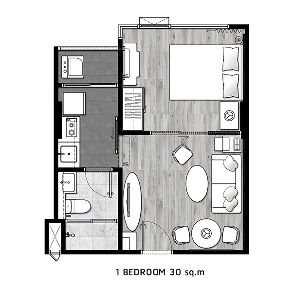 - ห้องแบบ 1 bedroom พื้นที่ใช้สอย 30.00 ตร.ม.