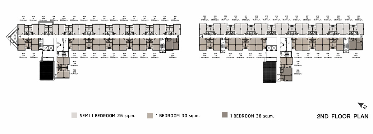 Master Plan อาคาร A และ อาคาร B ชั้น 2 - อาคาร A : เป็นส่วนพักอาศัยมียูนิตต่อชั้นอยู่ที่ 30 ยูนิต เป็นห้องขนาด 26.00 ตร.ม. 16 ยูนิต, ห้องขนาด 30.00 ตร.ม. 13 ยูนิต และห้องแบบ 38.00 ตร.ม. อีก 1 ยูนิต