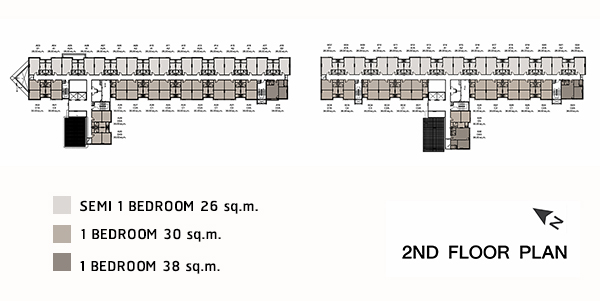 - ห้องชุดพักอาศัย : แบ่งเป็น 3 Type ได้แก่ Semi 1 Bedroom ขนาด 26.00 ตร.ม., 1 Bedroom 30.00 ตร.ม. และ 1 Bedroom 38.0 ตร.ม.