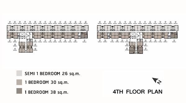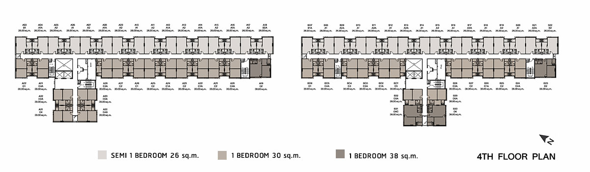 Master Plan อาคาร A และ อาคาร B ชั้น 3-8 - อาคาร A : ยูนิตต่อชั้นเพิ่มขึ้นมาเล็กน้อยอยู่ที่ 32 ยูนิต เป็นห้องขนาด 26.00 ตร.ม. 16 ยูนิต, ห้องขนาด 30.00 ตร.ม. 15 ยูนิต และห้องแบบ 38.00 ตร.ม. อีก 1 ยูนิต