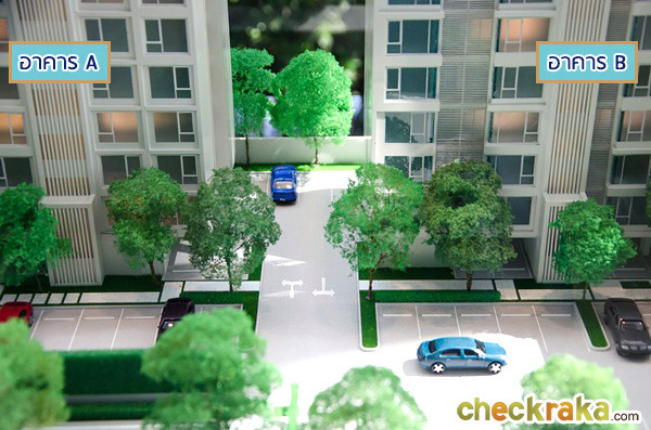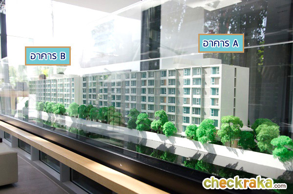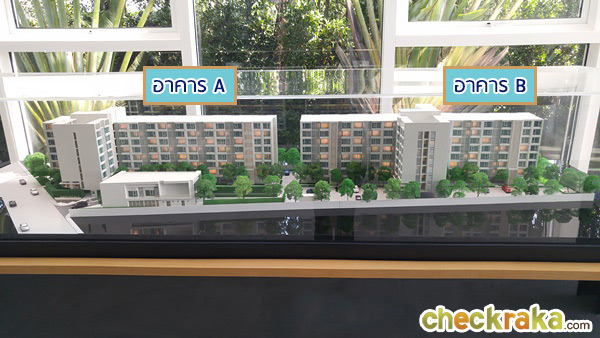 โมเดลอาคาร A มุมมองจากทิศเหนือ ติดถนนลาดปลาเค้า ซึ่งเป็นทางเข้า-ออก ของโครงการ