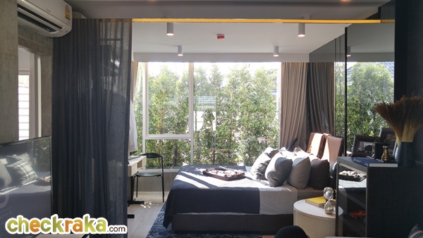 เป็นห้อง Studio ขนาดใหญ่โปร่งโล่ง แต่ถ้าต้องการความเป็นส่วนตัวก็สามารถกั้นห้องทำเป็นห้องแบบ 1 bedroom ได้เพราะทางโครงการออกแบบพื้นที่ไว้รองรับอยู่แล้ว ความสูงจากพื้นถึงฝ้าห้องนั่งเล่นและห้องนอนสูง 2.45 เมตร,