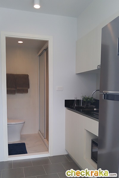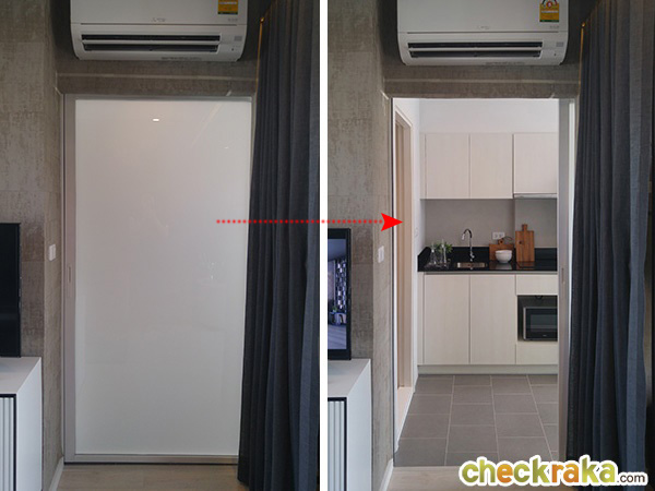 ด้านขวาของเคาน์เตอร์ครัวเป็นพื้นที่สำหรับวางตู้เย็น ที่ติดกับประตูระเบียง ที่เป็นบานเลื่อนแบบ 2 ตอน