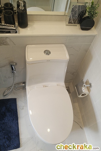 โถสุขภัณฑ์ของ American Standard สายฉีดชำระอยู่ทางซ้ายมือ มี Low wall ไว้สำหรับวางของได้