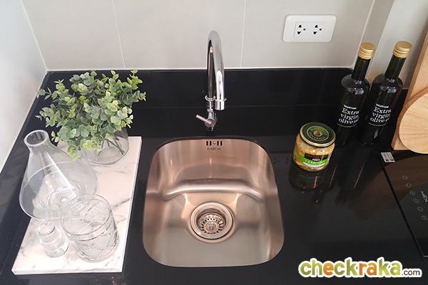 Top ครัวเป็นหินเทียมสีดำ ได้อ่างล้างจานแบบหลุมเดี่ยวขนาด 36 x 30 ซม. และก๊อกน้ำของ Mex