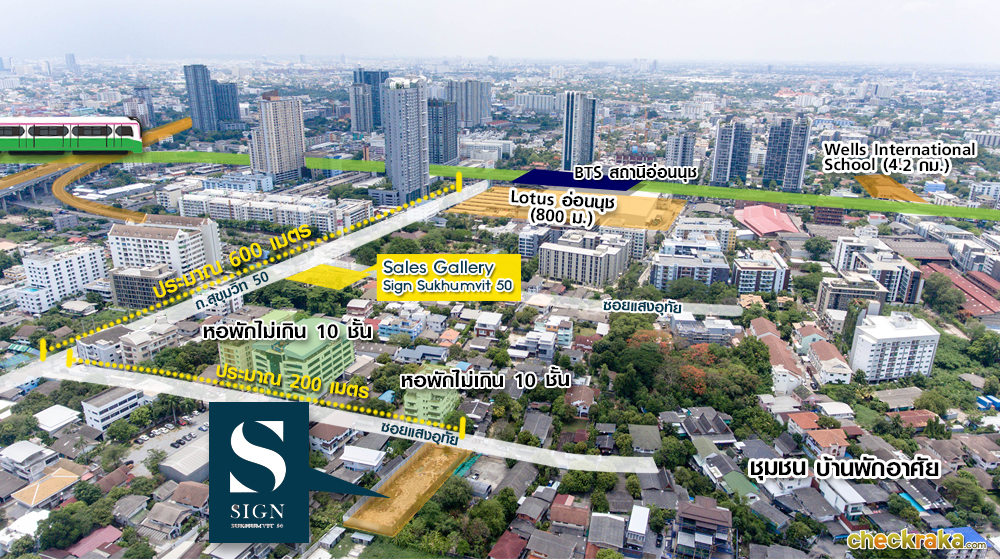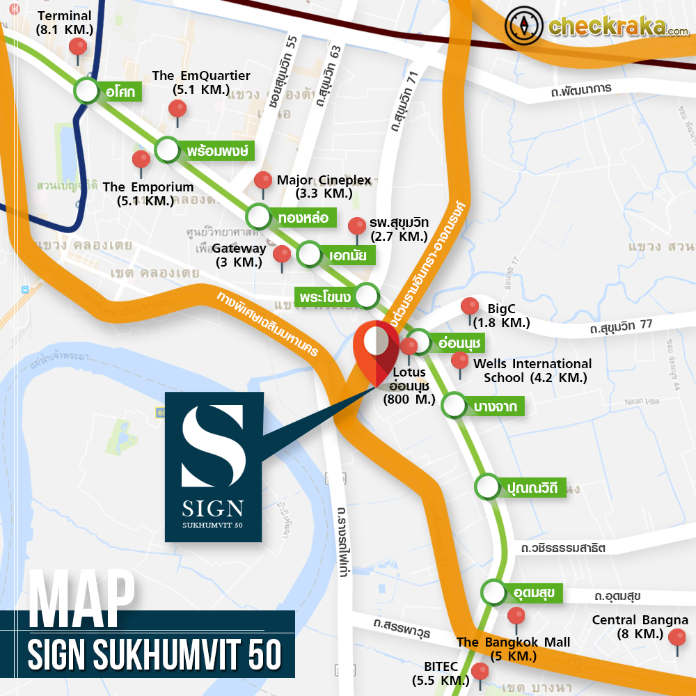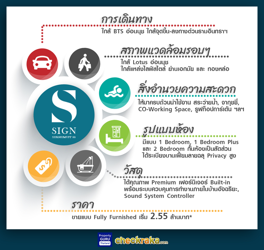 ซายน์ สุขุมวิท 50 (Sign Sukhumvit 50) เน้นความเป็นส่วนตัวด้วยจำนวนยูนิตที่น้อย และทำเลที่เงียบสงบ เหมาะกับการพักอาศัยอย่างแท้จริง เพียง 5 นาทีจาก BTS อ่อนนุช พร้อมรถรับ-ส่ง (ไป-กลับ BTS อ่อนนุช) และ โลตัส อ่อนนุช และเพียง 10 นาที ใกล้แหล่งไลฟ์สไตล์ ร้านอาหาร และแหล่งช้อปปิ้งชื่อดัง ย่านเอกมัย และทองหล่อ เดินทางง่ายด้วยจุดขึ้น-ลง ทางด่วน 2 เส้นทาง ตัวโครงการตั้งอยู่ภายในซอยแสงอุทัยประมาณ 200 เมตร โดดเด่นด้วยวัสดุคุณภาพระดับพรีเมียม และการตกแต่งดีไซน์ภายในห้องที่ได้แบบครบทุกฟังก์ชั่นการใช้งาน และบานเฟี้ยมลายฉลุสีขาวที่โดดเด่นสะดุดตา ตามไปชมความสวยงามของโครงการนี้กันค่ะ