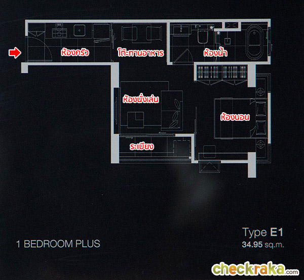 Layout ห้องแบบ 1 Bedroom Plus (Type E1) เดินเข้าห้องมาจะเจอกับโซนห้องครัว (ครัวปิด) ถัดไปเป็นโซนทานอาหาร ที่เชื่อมต่อกับห้องนั่งเล่น และระเบียง ห้องนอนกั้นแบ่งด้วยประตูกระจกบานเลื่อนแบบอิสระขนาดใหญ่เหมือนห้องที่แล้ว ส่วนห้องน้ำของ Type E1 จะย้ายมาอยู่ติดกับโซนทานอาหาร ไม่ได้อยู่ในห้องนอนเหมือนห้องที่แล้ว