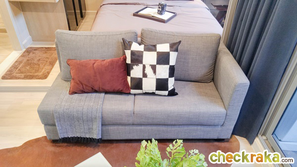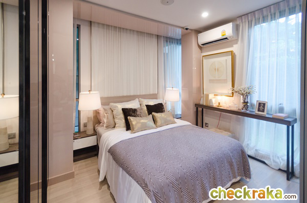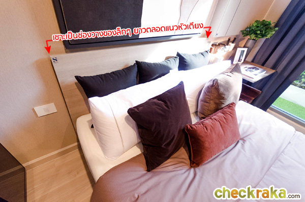 ระยะทางเดินจากปลายเตียงถึงโซฟาประมาณ 40 ซม. และจากเตียงถึงหน้าต่างประมาณ 100 ซม. ทางโครงการออกแบบให้หัวเตียงนอนเป็น Low-Wall เซาะเป็นช่องเล็กๆ กว้างประมาณ 3 ซม. ยาวตลอดแนวหัวเตียง สามารถวางหนังสือ หรือวางกรอบรูปเล็กๆ ไว้ที่หัวเตียงนอนได้