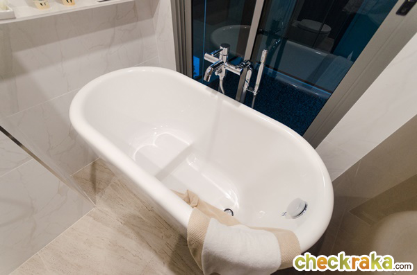 ภายในอ่างออกแบบมาเป็นเหมือนเก้าอี้เล็กๆ ไว้สำหรับให้นั่งแช่ภายในอ่างได้อย่างสบายๆ ไม่ต้องนอนเกรงให้เมื่อย