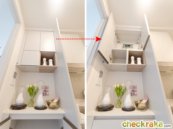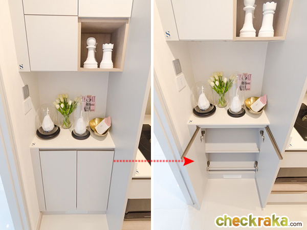 มีพื้นที่เก็บของมาให้ทั้งด้านบนและด้านล่าง โดยด้านบนเครื่องดูดควันเป็นตู้บานเปิดแบบกดกระเด้งสำหรับเก็บเครื่องปรุง หรือจะเก็บซอสสำหรับทำอาหารก็ได้ ช่องวางไมโครเวฟจะออกแบบให้อยู่ด้านล่าง เวลาใช้งานจริงจะค่อนข้างสะดวกกว่าวางไว้ด้านบน สำหรับลูกบ้านที่ตัวเล็กๆ หรือไม่สูงมากเวลายกอาหารเข้าออกจากไมโครเวฟอาจจะหกเลอะเทอะได้