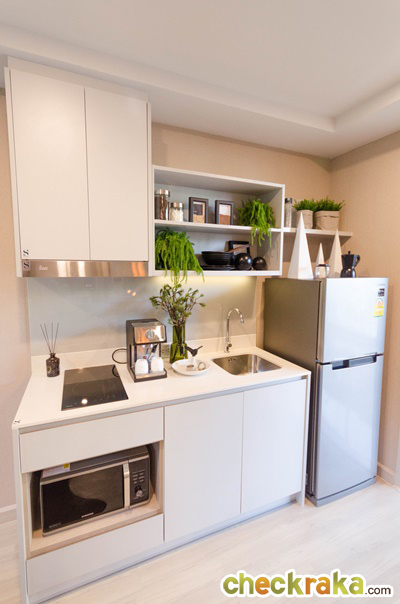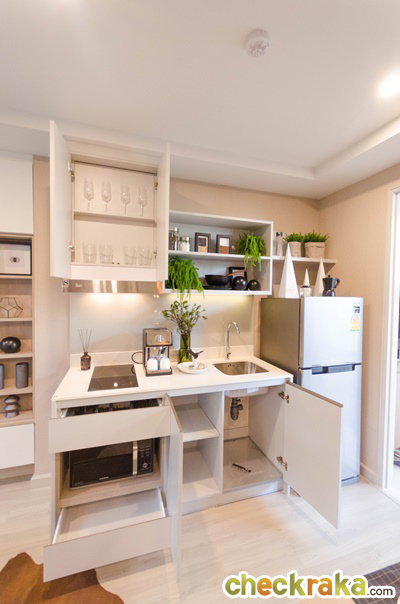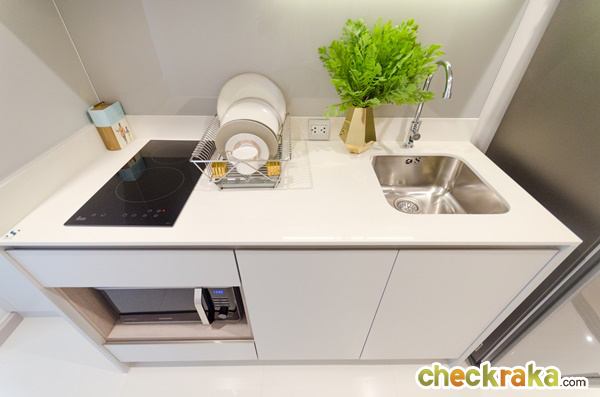 ห้อง Type นี้จะเป็นครัวแบบเปิด ได้ชุดครัวสำเร็จรูปของ RCD ขนาดประมาณ 60x23x34 นิ้ว พร้อมเครื่องดูดควัน Teka ระบบดูดอากาศออกนอกตัวอาคาร ประสิทธิภาพการดูดดีกว่า สามารถทำอาหารหนักได้มากกว่าการใช้เครื่องดูดควันระบบหมุนเวียน หน้า Top เคาน์เตอร์ครัวเป็นหินเทียมปูสูงขึ้นมาจนถึงส่วน Back Splash เลย พื้นที่วางตู้เย็นกว้างประมาณ 68 ซม.