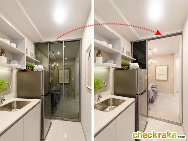 ห้องครัวแบบครัวปิด กั้นด้วยประตูบานเลื่อนกระจก 3 บาน สามารถเปิดได้กว้างทำให้เดินได้สะดวกมากยิ่งขึ้น