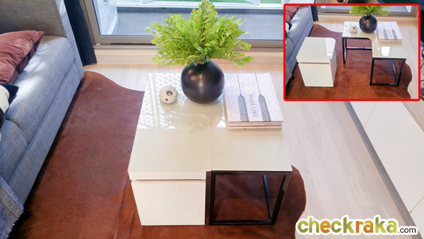 ได้โต๊ะกลางสีขาวขนาดไม่ใหญ่มาก วัสดุหน้า Top กระจกง่ายต่อการทำความสะอาด บางส่วนออกแบบให้เป็นที่เก็บของและสามารถเลื่อนแยกออกมาได้อีกด้วย
