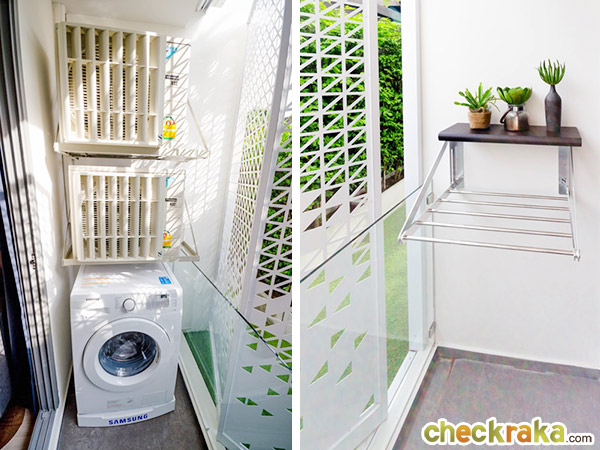 เครื่องซักผ้าและคอมเพรสเซอร์แอร์อยู่ทางซ้าย ทางขวาเป็นราวแขวนผ้า foldable