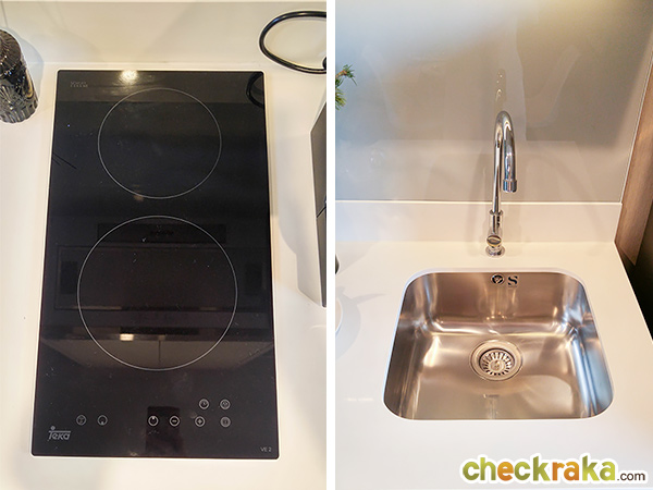 ได้เตาไฟฟ้าแบบ 2 หัวของ Teka อ่างล้างจานสแตนเลสแบบ Under Sink และก๊อกน้ำก็ของ Teka เช่นกัน